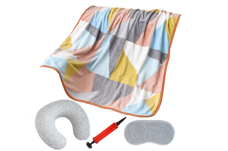 面料:U枕:針織布(聚酯纖維) 內(nèi)芯:加厚PVC 眼罩:針織布(聚酯纖維) 毯子:金貂絨(聚酯纖維)